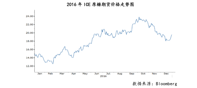 2016 年 ICE 原糖期货价钱呈冲高回落走势,全年共上涨 4。33 美分/磅,涨幅约 29%。ICE 原糖价钱全年走势可大致分为两个阶段。第一阶段为 1 月至 10 月上旬,原糖价钱探底后大幅反弹,屡创近年新高;第二阶段为 10 月中旬至 12 月,原糖价钱自高位回落。
