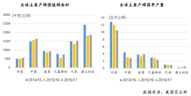 从全球棉花供应端看,2016/17 年度全球棉花产量估计增加 8%,产量增幅次要来自于除中国以外其他全球次要产棉国(印度、美国、巴基斯坦、巴西和)。具体来看,中国国内植棉面积可能削减,由此导致棉花产量削减。而正在其他次要出产国,印度因为季风降水推迟导致植棉面积削减 12%,但其单产量增幅估计抵消植棉面积降幅,全体看印度棉花产量无望添加 13 万吨;美国正在 2016/17 年度棉花产量增幅很大,得益于植棉面积和单产双双同比增加;巴基斯坦和巴西的植棉面积估计削减,但单产料将添加;的植棉面积和单产估计均呈现增加。