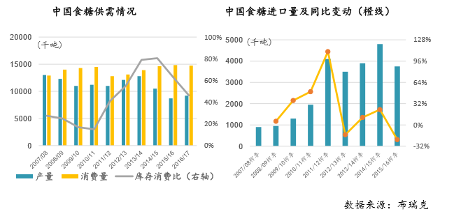 从进口看,2016/17 榨季国内食糖进口环境将次要取决于进口政策,包罗进口关税能否上调以及进口配额的发放等。我国食糖进口正在 2014/15 榨季达到峰值 480 万吨后呈现较着回落,2015/16 榨季进口量共 375 万吨,同比下降 105 万吨,降幅达 22%,而 2016/17 榨季的前两个月进口总量仅为 24 万吨,同比削减 61%。进入 2017 年,国内糖进口量存正在较大的不确定性。商务部于 2016 年 9 月份展开了为期六个月的进口糖保障办法立案查询拜访,查询拜访成果估计最迟于 2017 年 3 月发布。若是查询拜访成果成立,则食糖进口配额表里关税可能均上升至 100%以上,届时进口成本显著提高,进口量料将随之大幅削减;若是查询拜访成果不成立,则进口关税维持不变,进口量受进口配额量的影响。