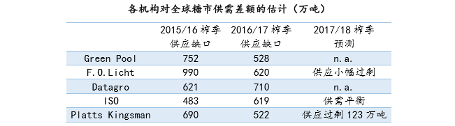 至于 2017/18 榨季,假定 2017 年气候一般,则该榨季全球产量无望上升并缩窄供需缺口,目前一些机构预测 2017/18 榨季全球糖市供需无望沉回均衡,以至呈现小幅供应过剩,全球糖周期供应欠缺阶段或将竣事。不外因为从产国气候有不确定性,2017/18 榨季糖供需存正在较大变数。