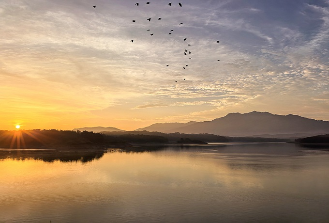 初秋的晚上,朝霞铺撒正在静谧的水面上,群鸟腾空飞起,愉快地驱逐即将到来的金秋丰收季。(商城县纪委监委 周黎明 摄)。