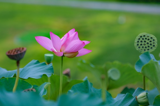 粉色荷花正在荷叶间盛放,姿势鲜艳。白露时分,但秋意已悄悄浸湿。此时的荷花,既留存着夏季的优美,又因白露,多了份属于初秋的沉静取婉约。(林州市纪委监委 秦阳 摄)!