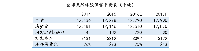 按照天然橡胶出产国协会(ANRPC)、国际橡胶研究小组(IRSG)数据估算,2016 年全球天胶产量 1229 万吨,同比增加约 0。1%,天胶消费量 1251 万吨,同比增加约 3%,产销缺口 22 万吨,期末库存从上岁暮 331。2 万吨降至 309。2 万吨。2016 年东南亚天胶出产遭到了厄尔尼诺现象的影响,从产区可开胶下降,加之胶农的割胶志愿不强,导致 2016 年天胶产量估计仅添加 1。2 万吨,远小于按照 ANRPC 新增种植面积所估算出的 40 万吨摆布增量。受此影响,全球天胶库存消费比估计从 2015 年 26%削减至 25%,低于此前三年平均程度。