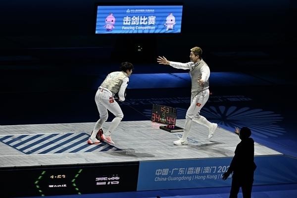 11月19日,十五运会须眉花剑集体金牌赛正在启德体育园启德体艺馆举行。由张家朗、蔡俊彦、梁千雨、吴诺弘构成的队,以45∶34击败福建队,夺得冠军。视觉中国供图