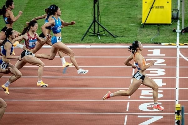 11月17日,广东广州,十五运会田径女子100米复赛,浙江选手陈妤颉正在角逐中。最终她正在决赛中以11秒10的成就夺冠。视觉中国供图